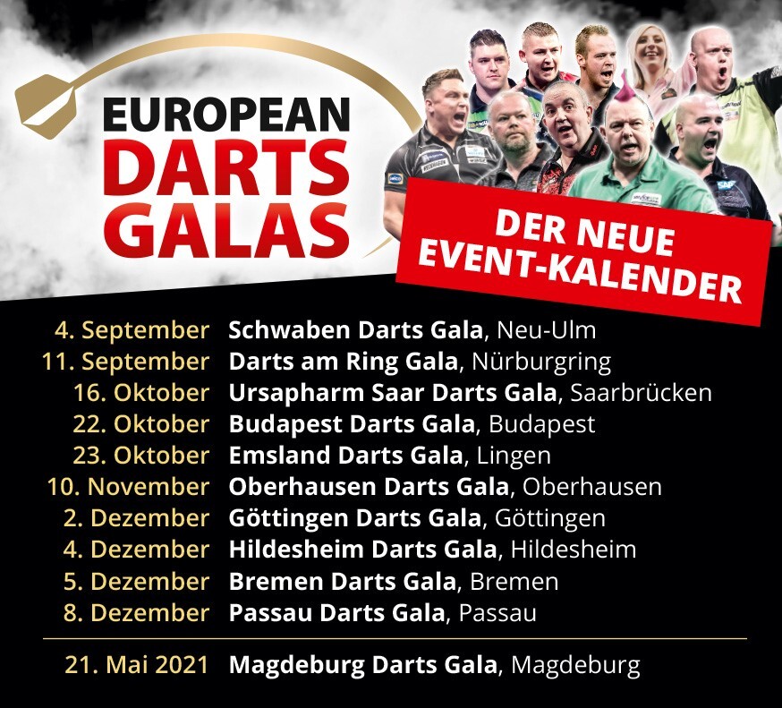 The Schwaben Darts Gala in Neu-Ulm, the Ursapharm Saar Darts Gala in Saarbrücken, the Oberhausen Darts Gala, the Passau Darts Gala and the Vienna Darts Gala can all be staged in 2020. Meanwhile the Magdeburg Darts Gala had to be rescheduled for 2021.
