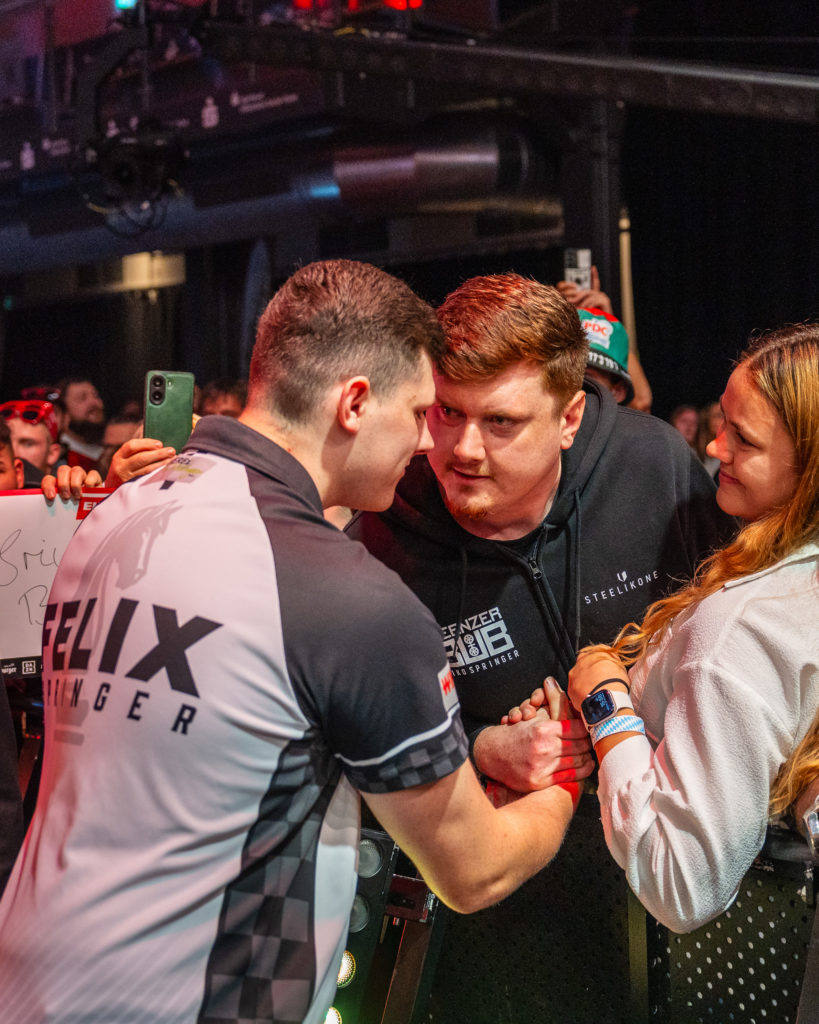 Vielleicht kommt das auch aus seinem Umfeld. Familie ist bei ihm kein Randthema, sondern Mittelpunkt. Sie sind immer da – nicht laut, aber fest. Nach großen Momenten dreht Niko sich zu ihnen, jubelt in ihre Richtung. Es ist sein Ruhepol, seine Erinnerung daran, wer er ist und warum er so spielt, wie er spielt. Bruder Felix spielt selbst erfolgreich Darts. Vater („Meenzer Vadda“), Mutter („Meenzer Muddi“) und Freundin Laura („Meenzer Meedsche“) tragen passende Trikots, sind häufig live dabei. Für Springer ist diese Unterstützung zentral. Sie gibt Halt, bleibt Orientierung, auch an langen Tagen auf der Tour.